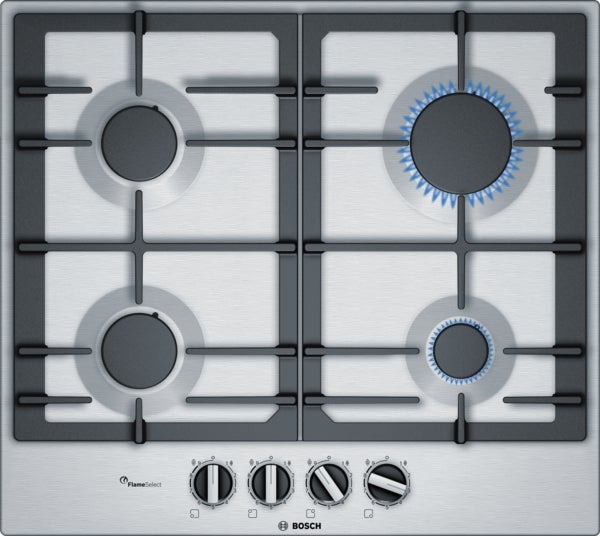 Roestvrijstalen gaskookplaat met FlameSelect: bereikt een perfect kookresultaat dankzij 9 nauwkeurig in te stellen vermogensstanden. - FlameSelect: Voor een nauwkeurige instelling van de vlam in negen standen. - Doorlopende gietijzeren pannendragers voor maximale stabiliteit en stevigheid. - Zwaardknoppen: voor eenvoudig instellen van de vlam.