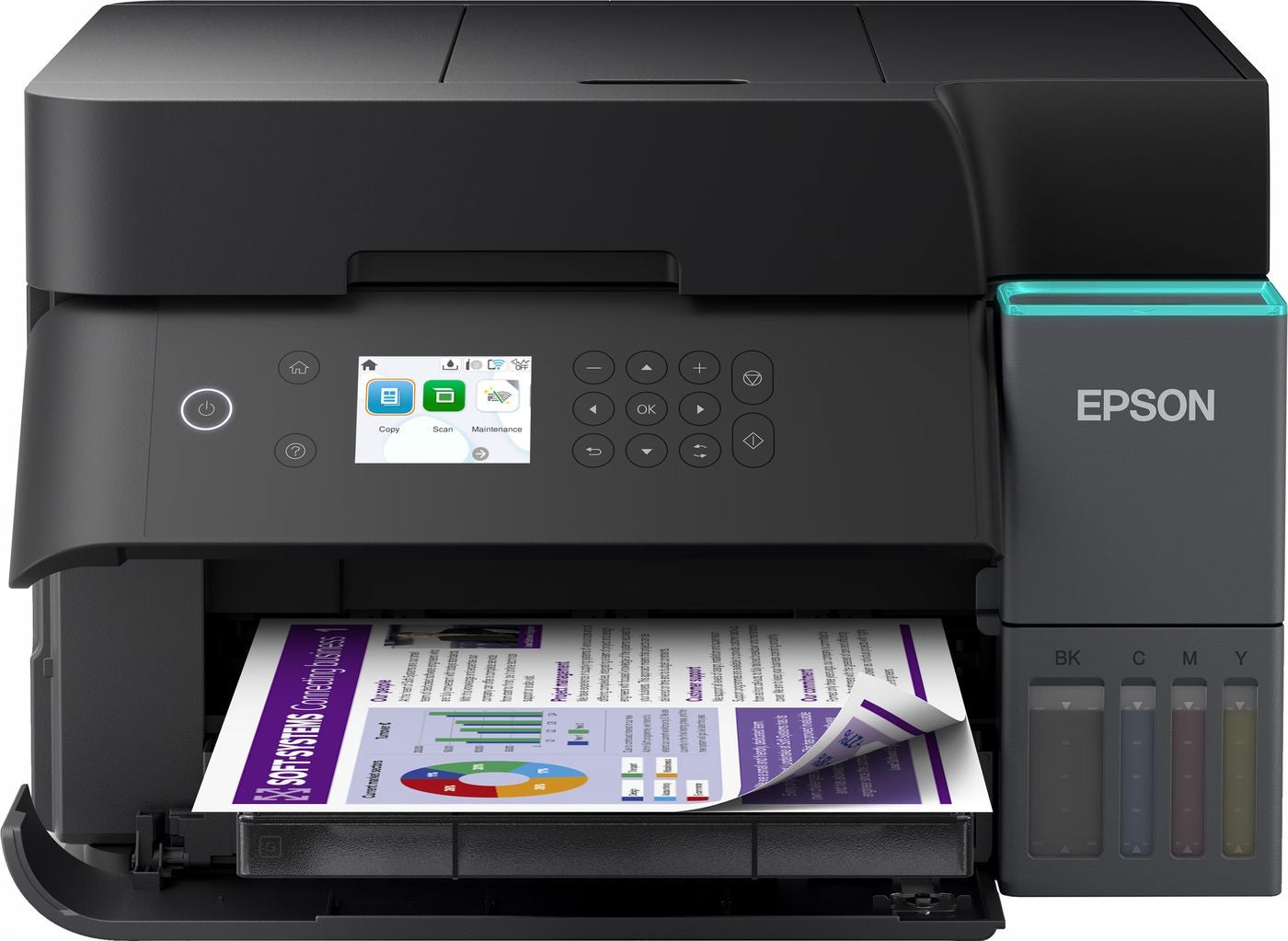 De ET-3950 heeft een strak en compact ontwerp. Hij past op een bureau of in een kast zonder veel ruimte in te nemen. Dankzij de PrecisionCore printkop is hij stil en efficiënt.