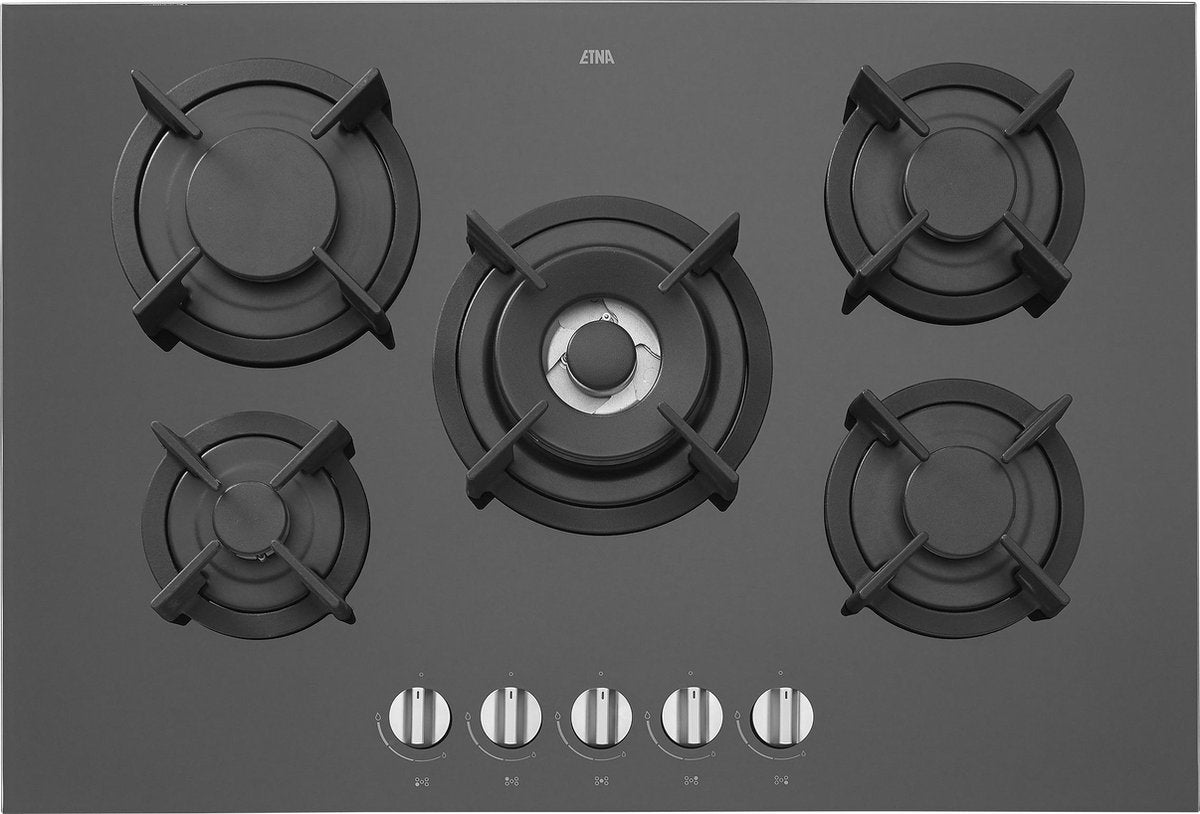 ETNA KGG673ZTA 73cm Gas op Glas inbouw gaskookplaat, Standaard 56cm nismaat, stepflame, gietijzer pannendragers, 5 pits,