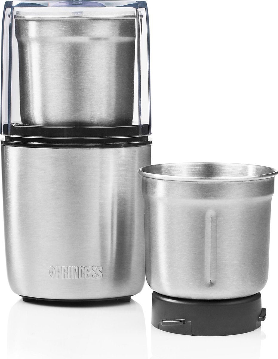 Bij de Princess Multi Hakmolen ontvang je twee bekers met verschillende messen. De maalbeker heeft twee messen en maalt koffiebonen en specerijen tot fijn poeder voor heerlijke verse koffie of geurige specerijenmengsel. De hakbeker heeft vier messen die groenten en verse kruiden grof of fijn snijden naar gelang je de hakmolen laat draaien. Maak zo je eigen verse pesto binnen enkele seconden.