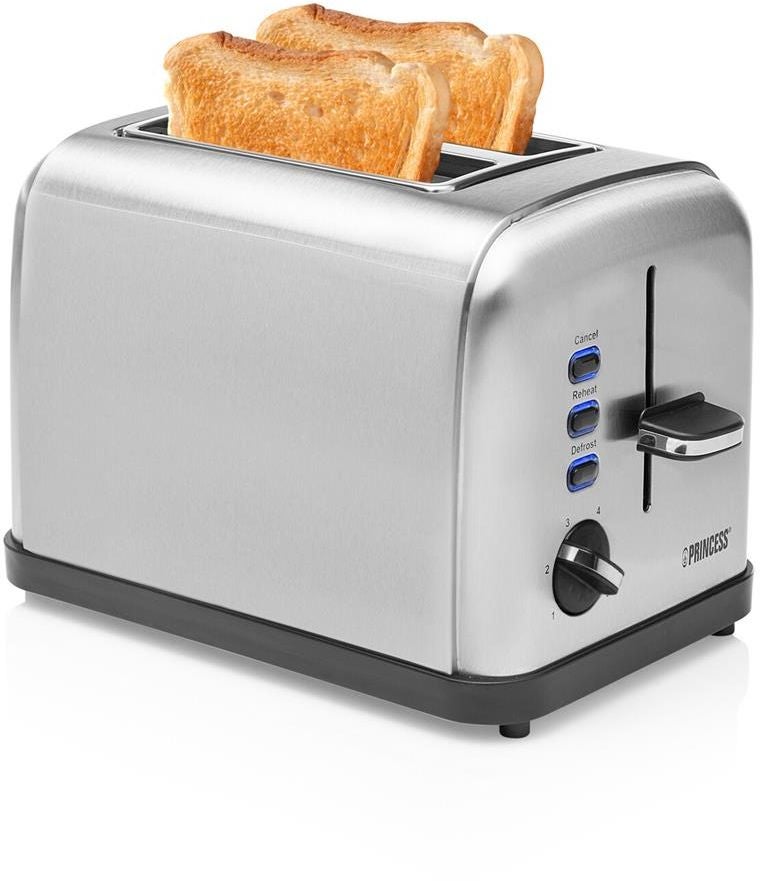 Stijlvolle broodrooster uitgevoerd in roestvrij staal met dubbele korte sleuvenCompleet met ontdooi- en verwarmfunctie voor bevroren brood en broodjesInclusief twee tostiklemmen voor heerlijke goudbruin geroosterde tosti’sMakkelijk op te bergen dankzij het compacte formaatVermogen van 850 Watt, dus ook geschikt voor op de camping.Wat vind je in de doos: