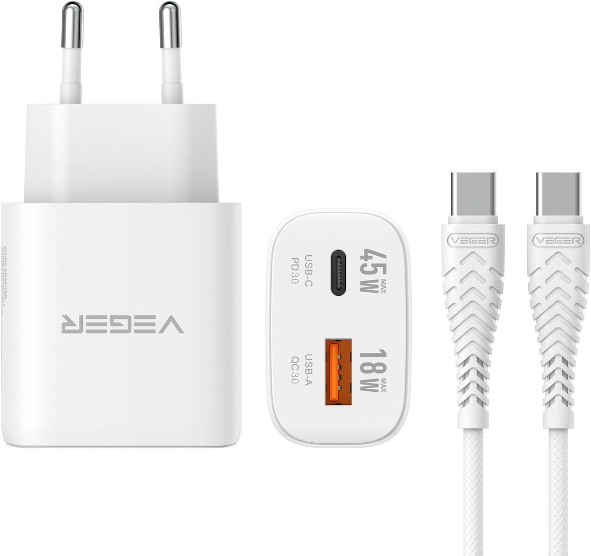 Veger snellader 45 Watt 2x USB Poort + USB-C Kabel 1,5m Nylon Wit
